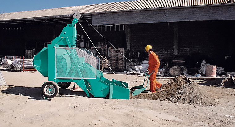 Bétonnière hydraulique à chargeur BIO 400 + Pelle tractée – Triphasé 400 V – Malaxage 320 L – 89 dB(A) – 1035 kg – IMER FRANCE