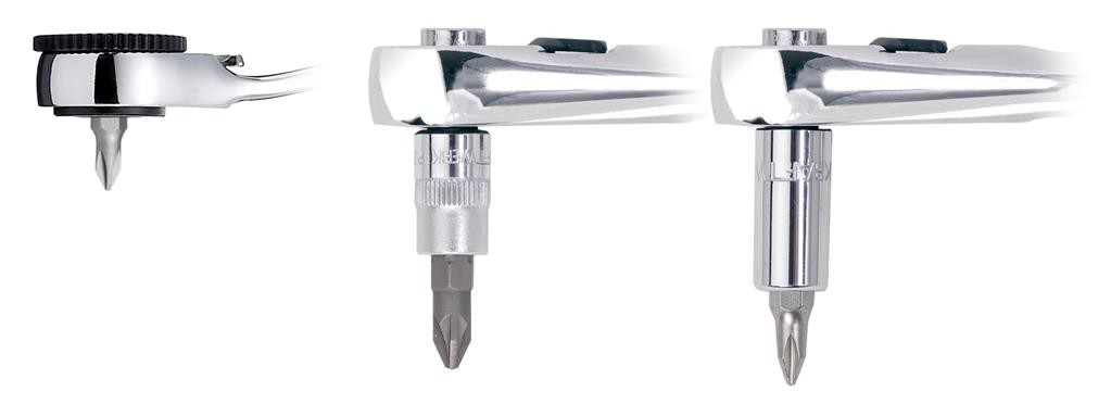 Réversible des deux côtés et coudée à 15°, pour le logement direct d’embouts 1/4″ + 5/16″ et de douilles 1/4″.