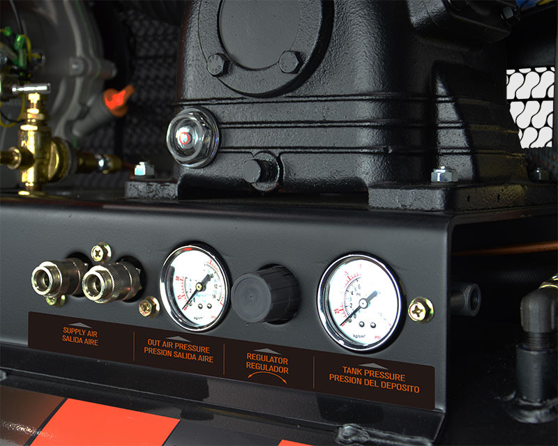 - Deux sorties d’air avec raccords rapides, un régulateur de pression et des manomètres indiquant la pression de sortie et la pression du réservoir.