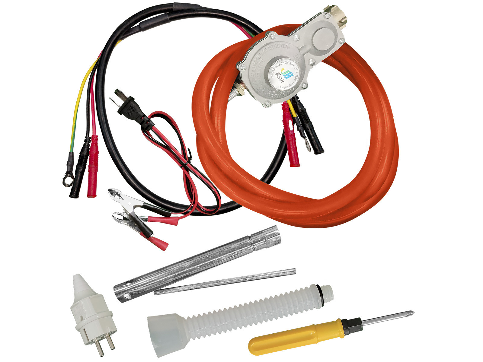 Le générateur est complété par des accessoires supplémentaires: clé à bougie, entonnoir pour un remplissage facile de l?huile moteur, câble de connexion parallèle, tuyau avec réducteur, fiche Schuko 16 A, tournevis PH2 6.0 mm, bornes pour charger la batterie