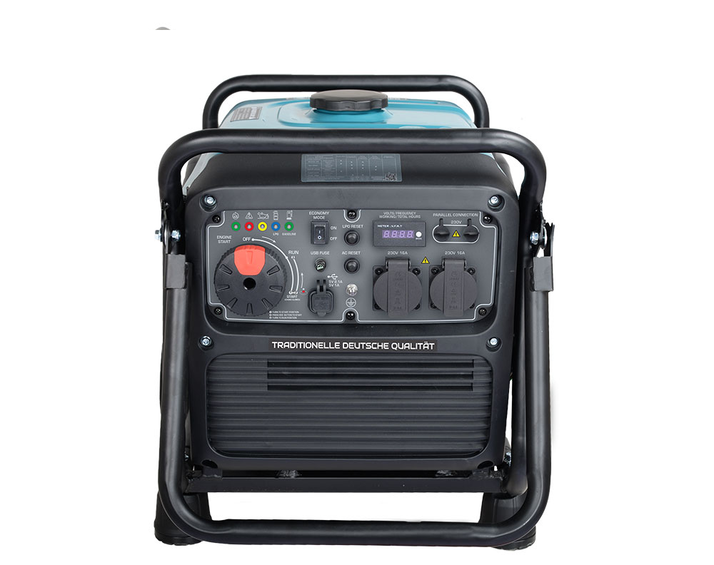 Emplacement pratique de toutes les fonctions: affichage LED multifonction (compteur horaire, tension, fréquence), indicateurs de contrôle de l?état du générateur signalant les paramètres différents de son fonctionnement, disjoncteur automatique de protection contre les surcharges ou les courts-circuits, alarme du niveau d?huile bas, bouton Reset pour réinitialisation du système de contrôle et restauration de l?alimentation électrique, dispositif de connexion parallèle de deux générateurs, deux sorties USB (5B/1A, 5B/2.1A), prise 230V et une borne de mise à la terre.