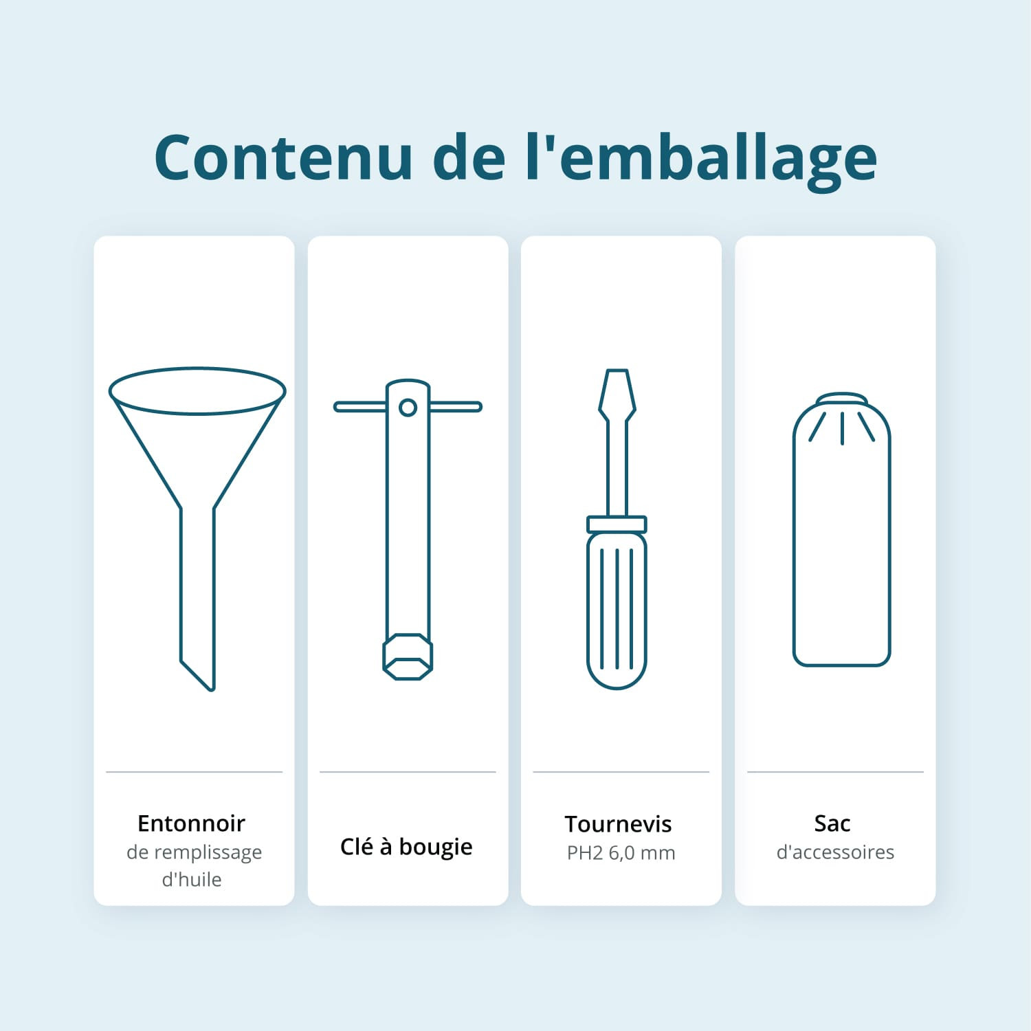 Un module électronique intégré à commande par microprocesseur contrôle le fonctionnement du groupe électrogèneet assure une tension de sortie stable de 230 V 50 Hz sous forme sinusoïdale, adaptée aux appareils électroniques sensibles.