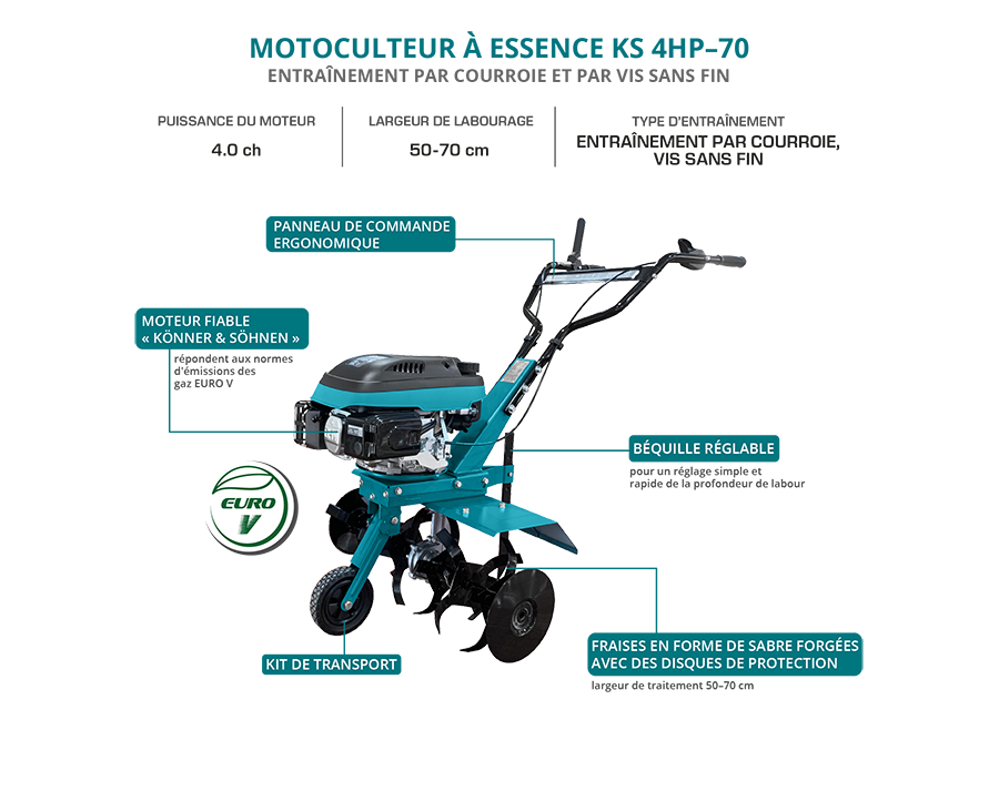 Motoculteur essence KS 4HP-70 – 5 CV – Labourage largeur 50/70 cm / profondeur ? 27 cm – Könner & Shönen