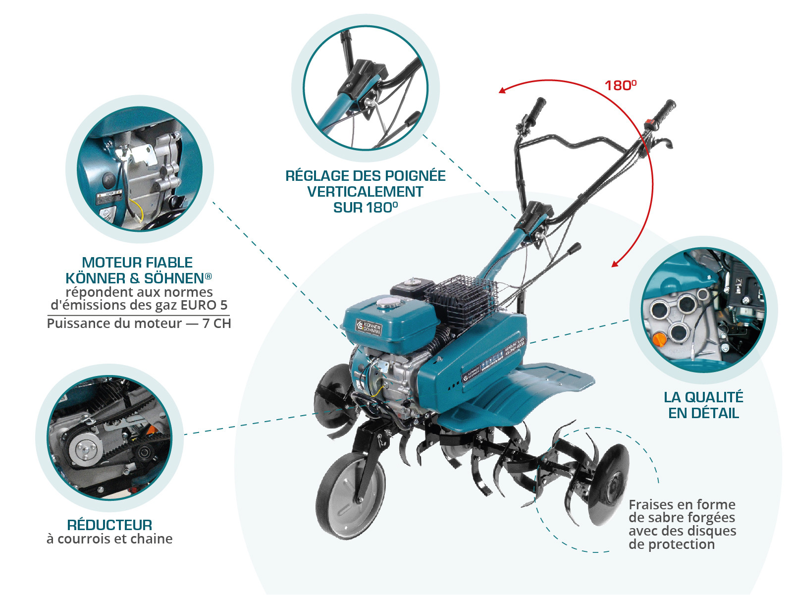 Motoculteurs à essence de TM «Könner & Söhnen» avec entraînement par courroie, capacité de 7 CV conviennent au traitement de tous types de sols, de l’argile meuble à l’argile vierge. Ce sont des unités agricoles pratiques, fiables et multifonctionnelles pour remplir plusieurs tâches: travail de tout type sol, plantation de cultures, récolte.