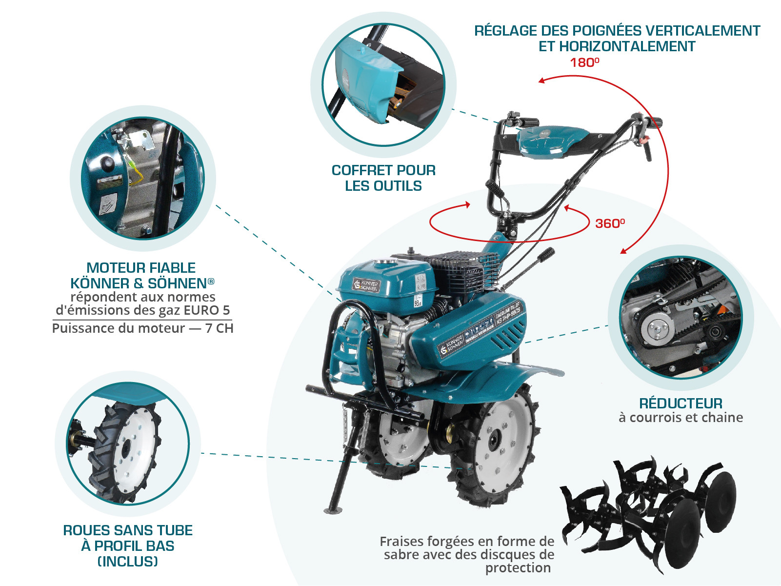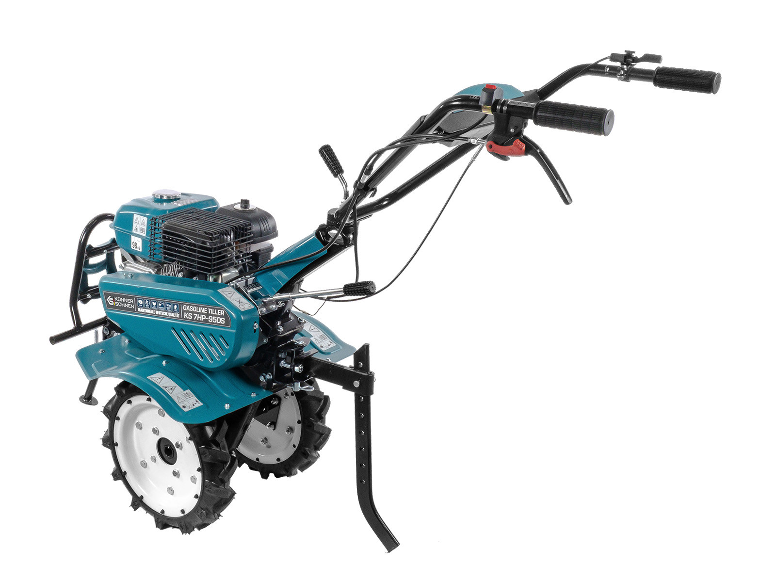 La construction unique est faite à l’aide de technologies modernes, a des dimensions compactes et un design élégant. Les moteurs à quatre temps puissants et économiques des motoculteurs Könner & Söhnen répondent aux normes écologiques les plus modernes d’émission de gaz d’échappement (EURO-V). Motoculteurs sont destinés aux travaux de longue durée et offrent une productivité élevée. Le modèle KS 7HP-950A permet l’installation d’accessoires supplémentaires (un buttoir, une charrue double, une arracheuse de pommes de terre). Possibilité d’acheter un ensemble complet avec des roues agricoles pneumatiques à une capacité de franchissement élevée.
