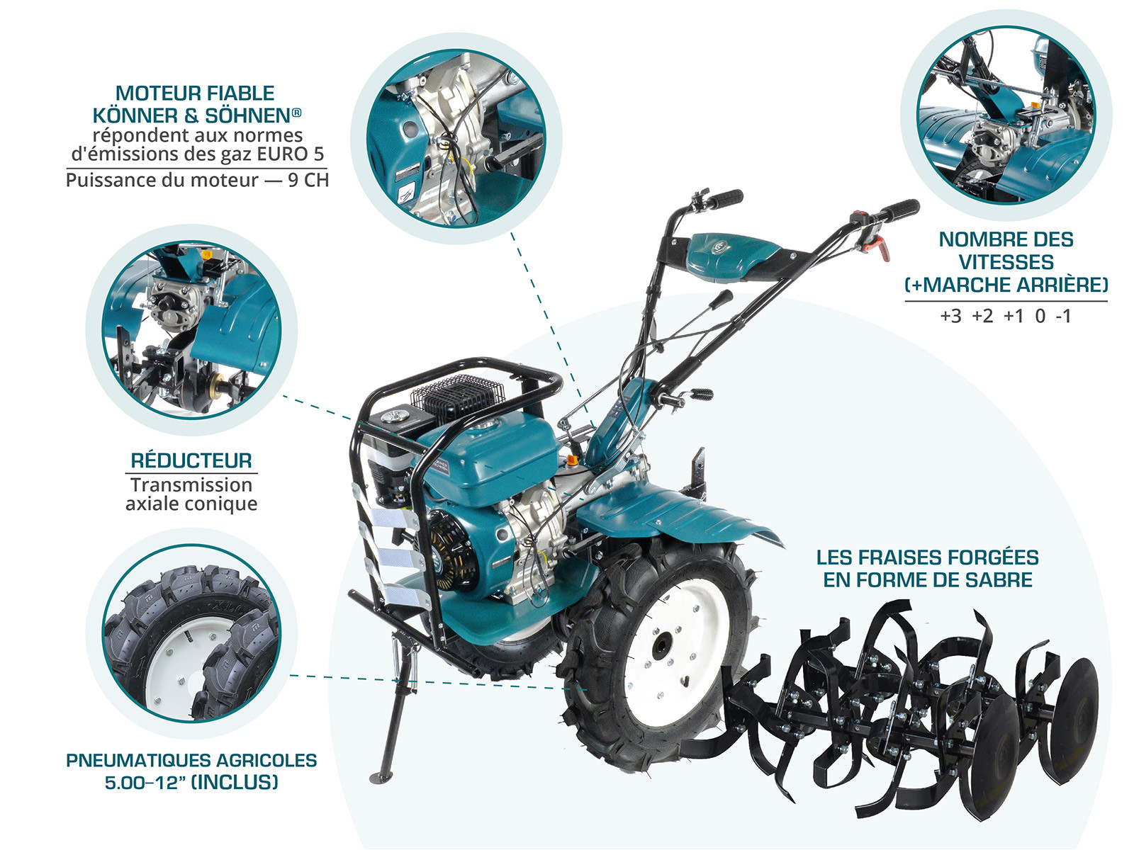 Il est également possible d’installer une remorque pour le transport de marchandises. La largeur de traitement du sol pour les motoculteurs de cette gamme atteint 134 cm! Les boites de vitesses à réducteur rendent les motoculteurs plus fiables, durables et prêts à supporter de lourdes charges. Les puissants moteurs Könner & Söhnen peuvent remplir des tâches de toute complexité et répondent à toutes les normes de qualité européennes, y compris les dernières normes d’émissions d’échappement EURO-V.