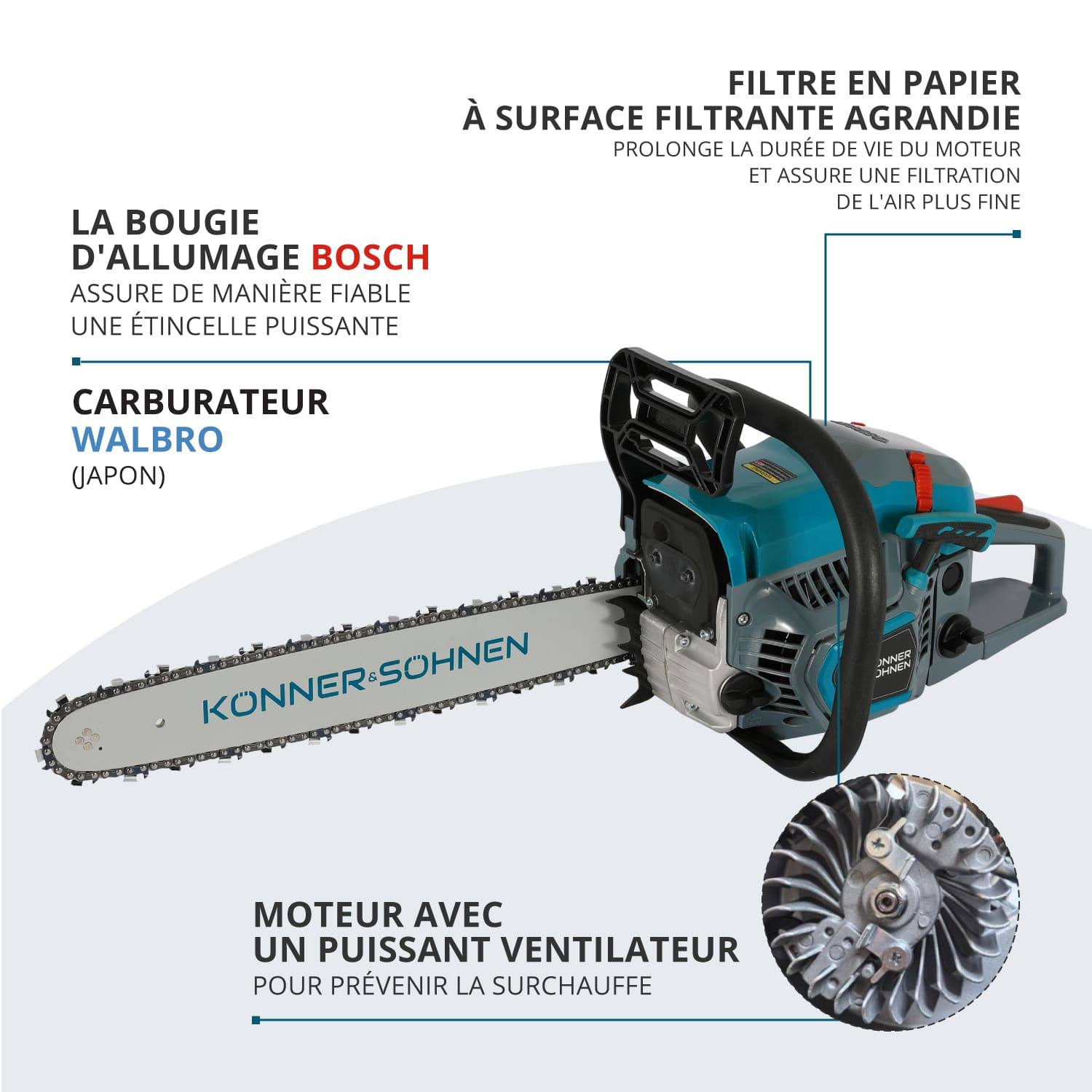 Son design ergonomique et son poids léger offrent un confort de travail même pour une utilisation prolongée. Rendez votre travail plus agréable avec la tronçonneuse Könner & Söhnen !
