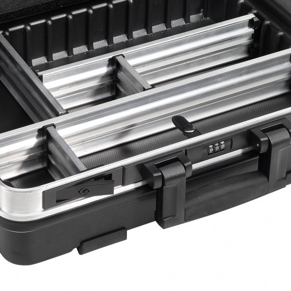 Cadre en aluminium robuste et un rebord de protection au niveau des arêtes protègent la mallette ainsi que les outils qu’elle contient.